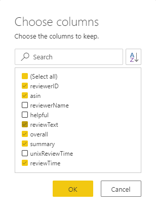 Uncheck the reviewerName, helpful, and unixReviewTime fields then click OK.